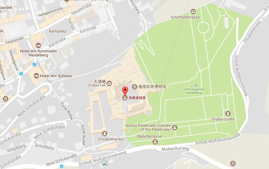 公交:从海德堡火车总站(Heidelberg central station)搭乘33路公交到Bergbahn站,搭乘齿轮火车Bergbahn (funicular railway) 到 Schloss (Palace)站下。
