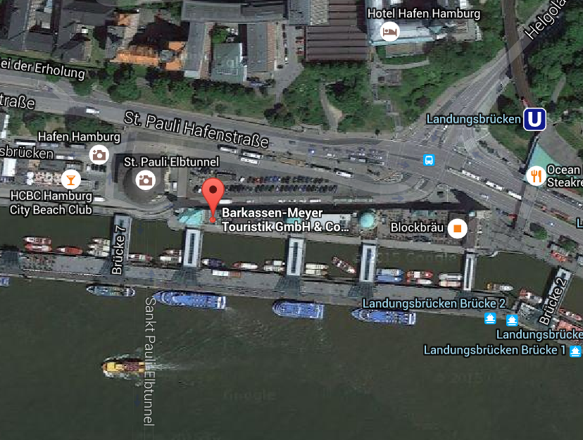 集合地点为圣保利码头栈桥(the Landungsbrücken in St. Pauli.)。请于旅游前先到办事处签到,位置在6号桥Meyer汽艇附近(Bridge 6 – Meyer launch)。