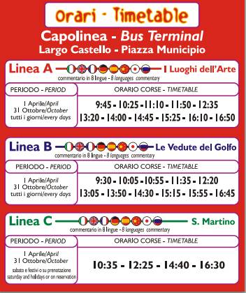 Line B - Le vedute del Golfo: 9:30, 10:05, 10:55, 11:35, 12:20, 13:05, 13:50, 14:30, 15:15, 15:55, 16:45 | Every day