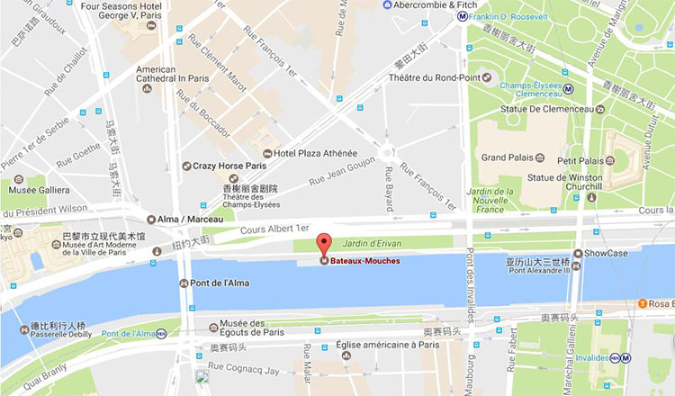 巴黎塞纳河游船是在Bateaux-mouches码头上船,该码头位于巴黎塞纳河畔阿尔玛桥(Pont de l'Alma)东侧。可由香榭丽舍大道沿乔治五世大街向南走到阿尔玛桥后向东走。