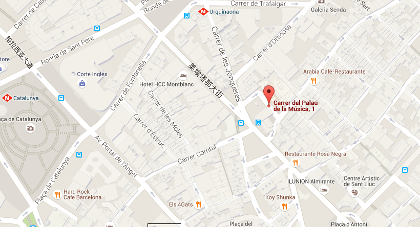 在邻近 Via Lairtana,著名的加泰罗尼亚音乐厅的露天咖啡店的對面出发。办事处的实际地址为 Calle Palau de la Musica, 1, 08011