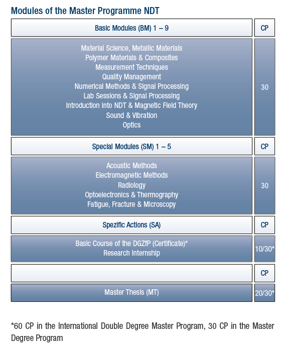 第三学期在弗劳恩霍夫应用研究促进协会位于德累斯顿和萨尔布吕肯的弗劳恩霍夫无损监测技术研究所(Fraunhofer IZFP)进行一个学期的实习,并参加德国无损检测技术学会的无损检测技术资格证书考试(DGZfP)。